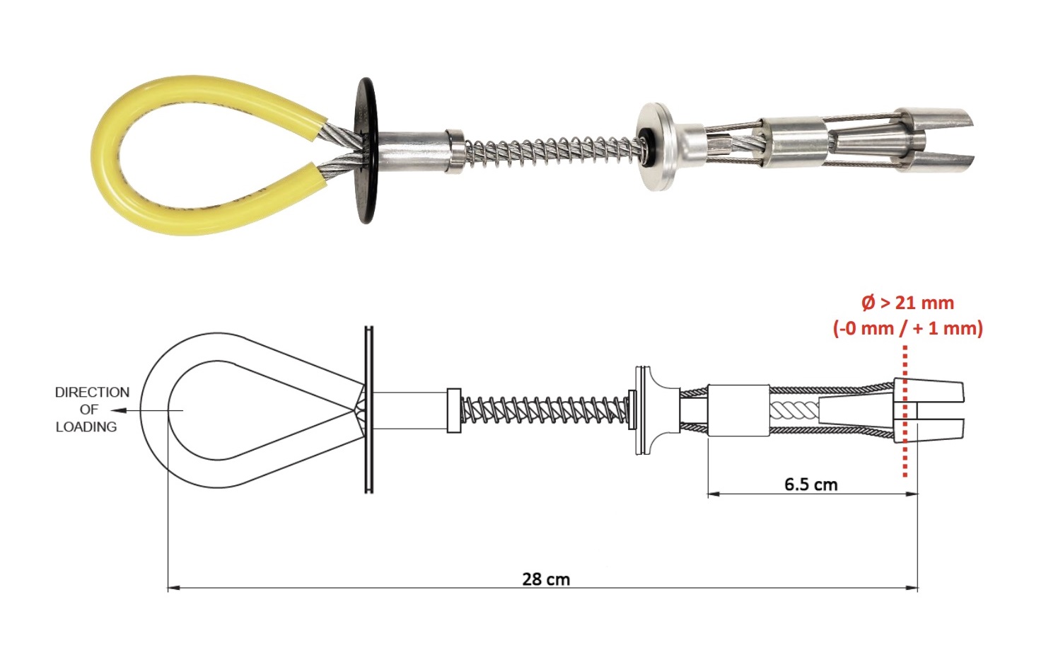 Anclaje reutilizable para hormigón, diseñado para ser instalado de forma muy rápida gracias a un botón de presión que calza el punto de anclaje en la estructura. Es necesario realizar un agujero en el hormigón con un diámetro de 19-20mm y una profundidad de 110mm
