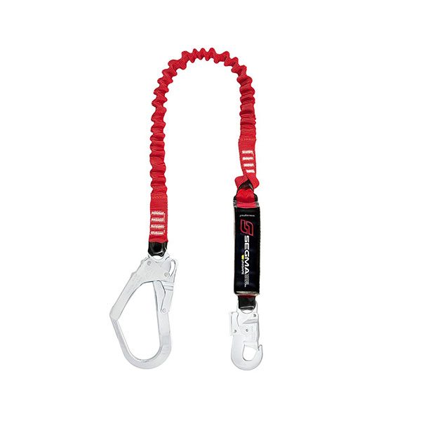 Amortiguador de caída con cabo de vida de cinta incorporado, forrado con cinta tubular de 35mm, Especialmente diseñado para trabajos en altura. El amortiguador es un sistema anticaídas que actúa en el caso que el trabajador caiga al vacío absorbiendo el impacto de frenado